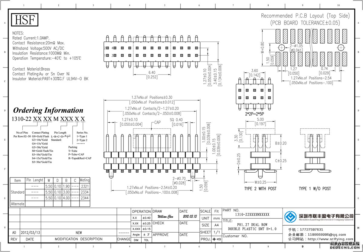 產(chǎn)品分類:排針連接器 產(chǎn)品規(guī)格:聯(lián)豐盈 1.27MM 雙排雙塑 管裝加夾持蓋 排針 產(chǎn)品介紹:額定電流:1.0amp電流電阻:20m最大絕緣電阻:1000m民承受電壓:AC 500V /分鐘工作溫度:40﹣℃+