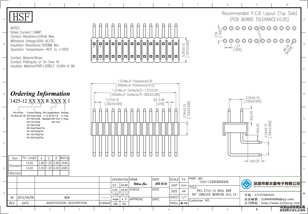 所屬分類:排針連接器 產(chǎn)品規(guī)格:1.27*2.54 雙排 90 DIP 排針 UL認證 技術(shù)參數(shù):額定電流:1.0amp電流電阻:20m最大絕緣電阻:1000m承受電壓:AC 500V /分鐘工作溫度:40﹣℃+ 105℃接觸材料: