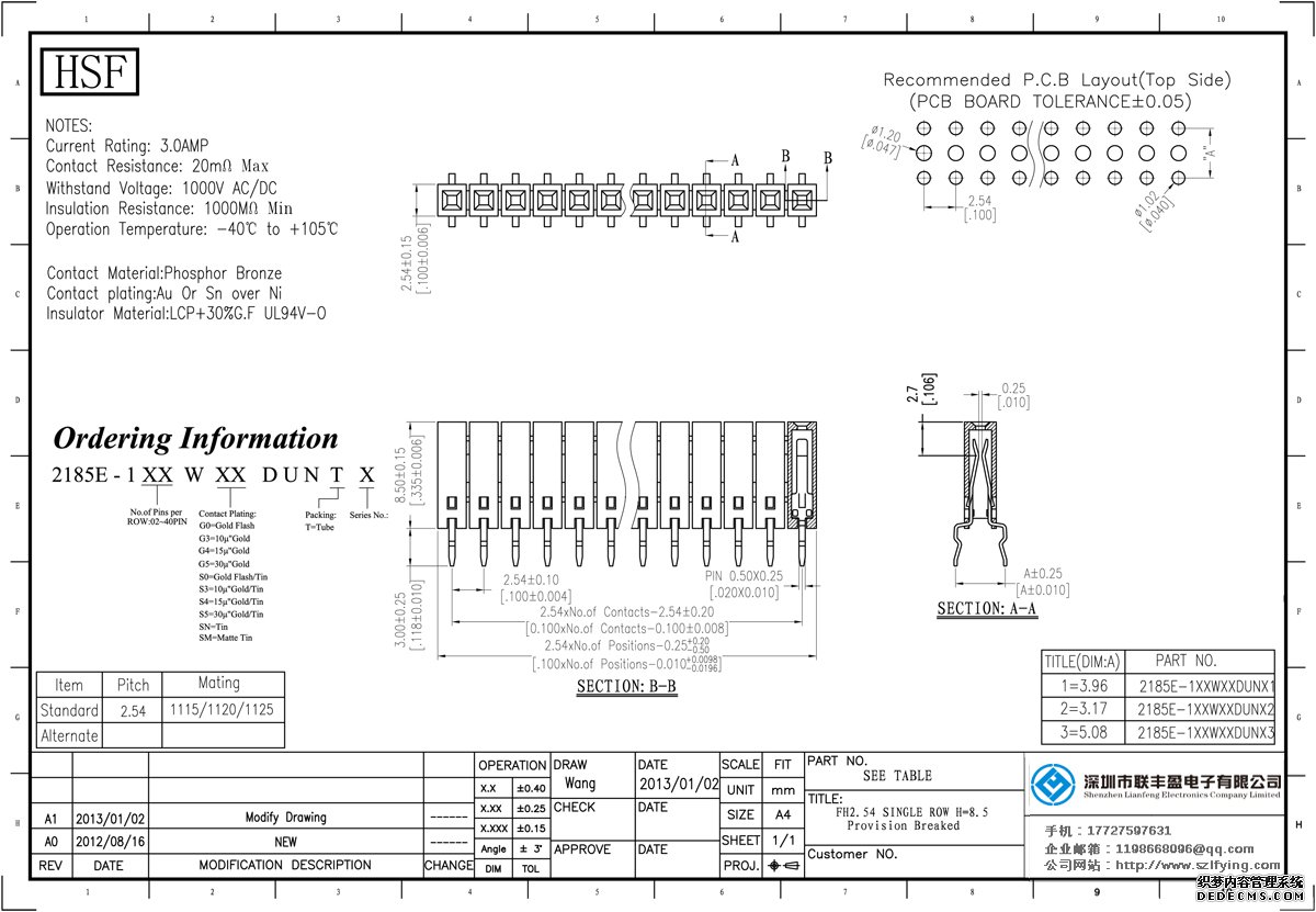 產(chǎn)品分類(lèi):排母連接器 產(chǎn)品規(guī)格:2.54MM H=8.5MM 單排 蜈蚣腳排母 廠家 聯(lián)豐盈 產(chǎn)品介紹:額定電流:3.0amp電流電阻:20m最大絕緣電阻:1000mmin耐壓:1000V AC /分鐘工作溫度:40﹣℃+ 105℃接