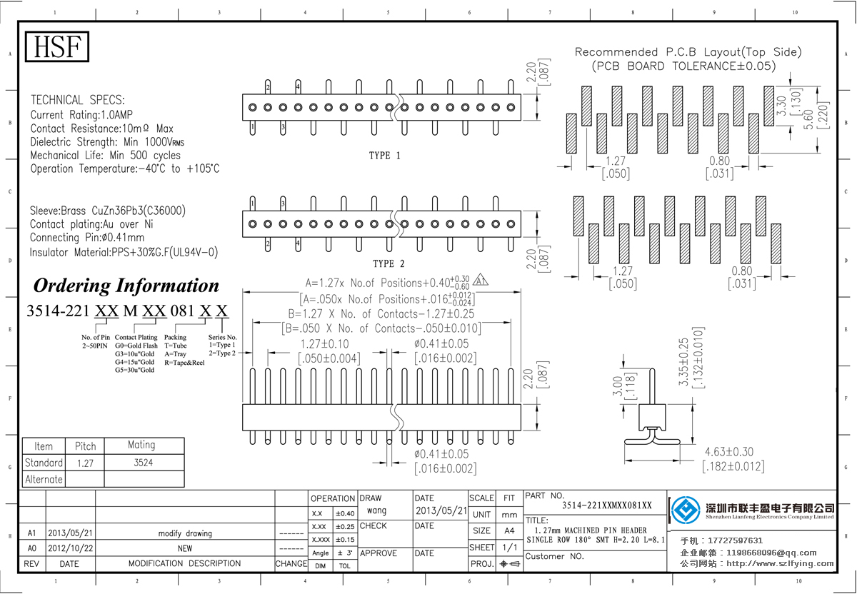產(chǎn)品分類(lèi):圓孔排針排母連接器 產(chǎn)品型號:聯(lián)豐盈 1.27MM H=2.2 180 SMT 圓型排針 廠(chǎng)家 技術(shù)參數:額定電流:1.0amp接觸電阻:10m0 Max Dielectric強度:MIN 500vrm5機械壽命:最少500次交配銷(xiāo):0.38