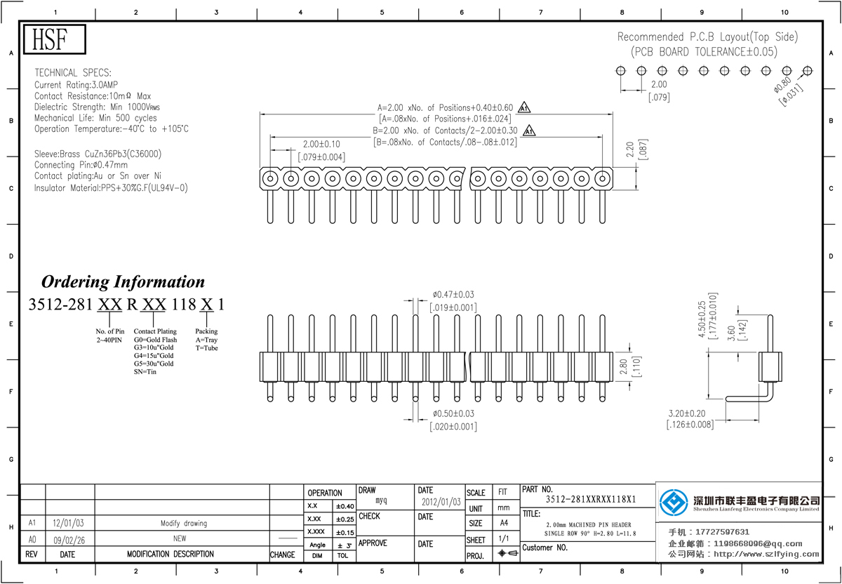 產(chǎn)品分類(lèi):圓孔排針排母連接器 產(chǎn)品型號:聯(lián)豐盈 2.0MM 單排 H=2.8 R/A 圓型排針 技術(shù)參數:額定電流:3.oamp接觸電阻:1om最大介電強度:MIN1000vrms機械壽命:最少500次交配引腳:0.400.66mm或