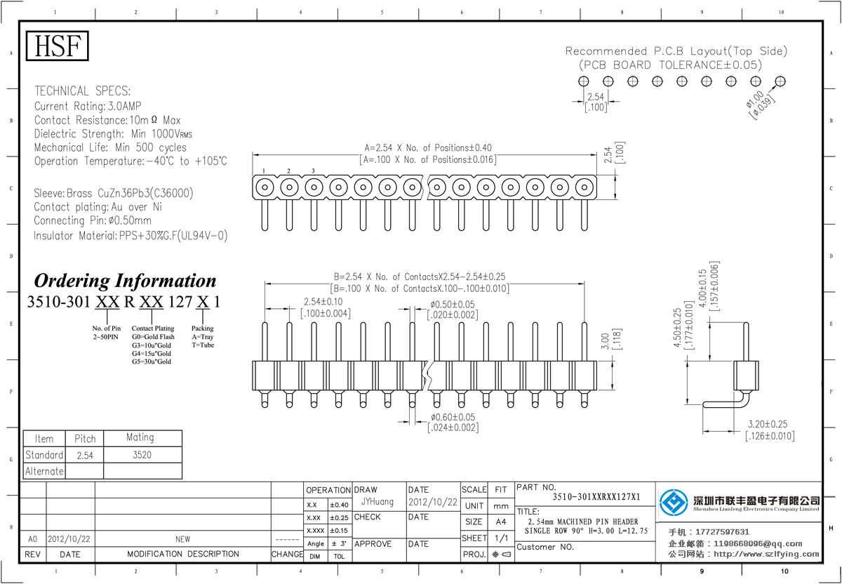 產(chǎn)品分類(lèi):圓孔排針排母連接器 產(chǎn)品型號:UL認證 2.54MM 單排 H=3.0 R/A 圓型排針 聯(lián)豐盈 技術(shù)參數:額定電流:3.oamp接觸電阻:1om最大介電強度:MIN 1000vrms機械壽命:最少500次交配銷(xiāo):0.