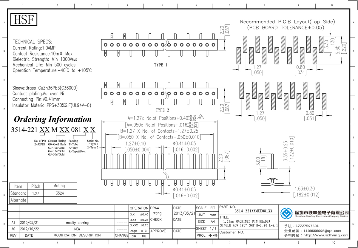 產(chǎn)品分類(lèi):圓孔排針排母連接器 產(chǎn)品型號:聯(lián)豐盈1.27MM H=2.2 單排 180 SMT 圓型排針 技術(shù)參數:額定電流:1.0amp接觸電阻:10m0 Max Dielectric強度:MIN 500vrm5機械壽命:最少500次交配銷(xiāo):0.380