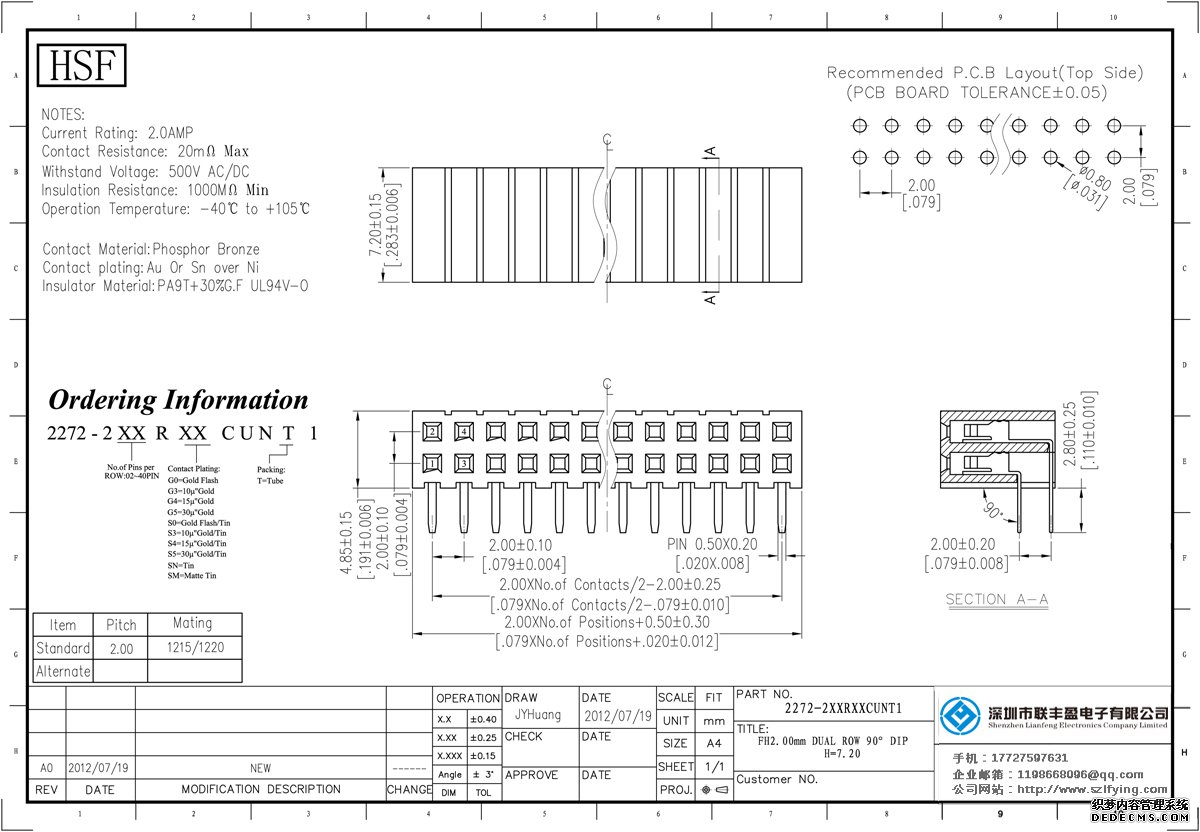 產(chǎn)品分類:排母連接器 產(chǎn)品規(guī)格:聯(lián)豐盈 2.0MM H=7.2MM 雙排 90DIP 排母 產(chǎn)品介紹:額定電流:3.0amp電流電阻:20m最大絕緣電阻:1000mmin耐壓:1000V AC /分鐘工作溫度:40﹣℃+ 105℃接觸材料: