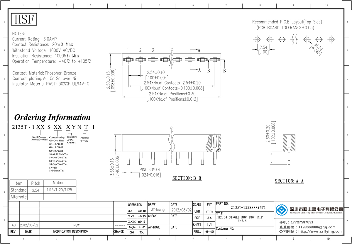 產(chǎn)品分類:排母連接器 產(chǎn)品規(guī)格:聯(lián)豐盈 2.54MM 5P 180 DIP 排母 定制 產(chǎn)品介紹:額定電流:3.0amp電流電阻:20m最大絕緣電阻:1000mmin耐壓:1000V AC /分鐘工作溫度:40﹣℃+ 105℃接觸材料: