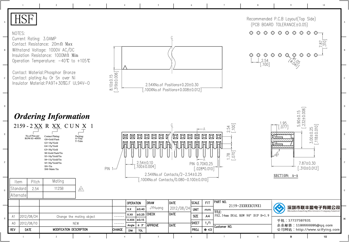 產(chǎn)品分類:排母連接器 產(chǎn)品規(guī)格:2.54MM H=5.9MM 雙排 90DIP 排母 廠家聯(lián)豐盈 產(chǎn)品介紹:額定電流:3.0amp電流電阻:20m最大絕緣電阻:1000mmin耐壓:1000V AC /分鐘工作溫度:40﹣℃+ 105℃接觸
