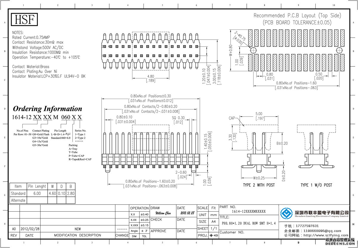 產(chǎn)品分類: 排針連接器 產(chǎn)品規(guī)格: 聯(lián)豐盈 0.8MM 單層雙排 180SMT 排針 技術(shù)參數(shù):額定電流:0.75amp電流電阻:20m最大絕緣電阻:1000m承受電壓:AC 500V /分鐘工作溫度:40﹣℃+ 105℃接觸材