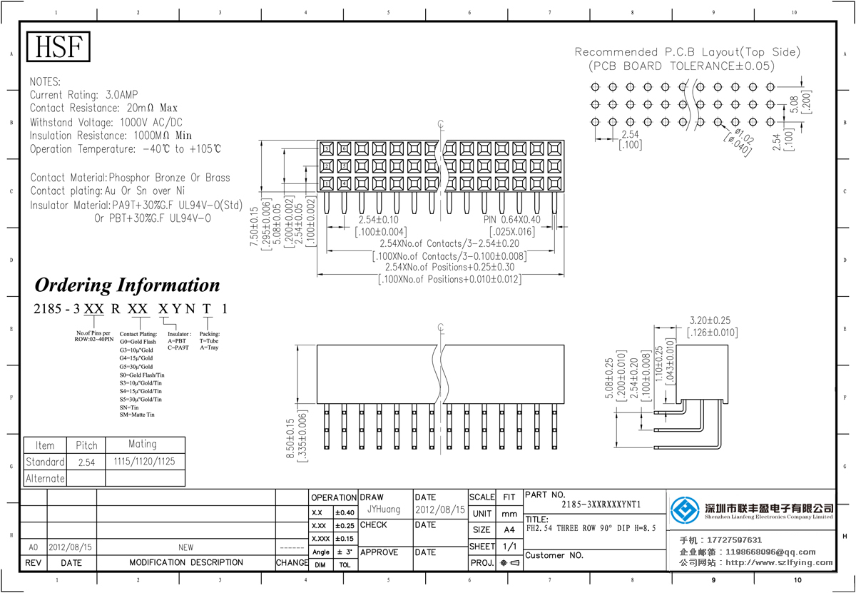 產(chǎn)品分類(lèi):排母連接器 產(chǎn)品規(guī)格:2.54MM H=8.5MM 三排 90DIP 排母 廠家 聯(lián)豐盈 產(chǎn)品介紹:額定電流:3.0amp電流電阻:20m最大絕緣電阻:1000mmin耐壓:1000V AC /分鐘工作溫度:40﹣℃+ 105℃接觸