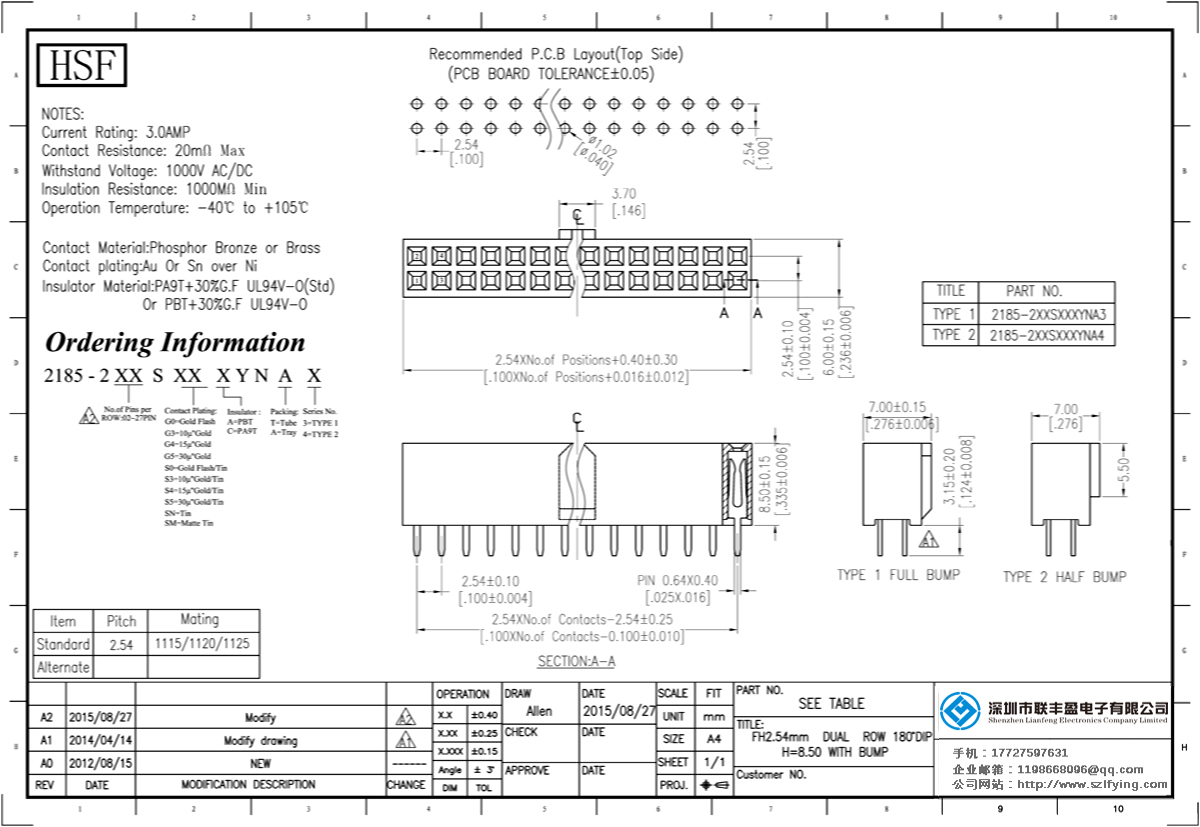 產(chǎn)品分類:排母連接器 產(chǎn)品規(guī)格:2.54MM H=8.5MM 帶凸點(diǎn) 雙排 180DIP 排母 連接器 產(chǎn)品介紹:額定電流:3.0amp電流電阻:20m最大絕緣電阻:1000mmin耐壓:1000V AC /分鐘工作溫度:40﹣℃+ 105℃接