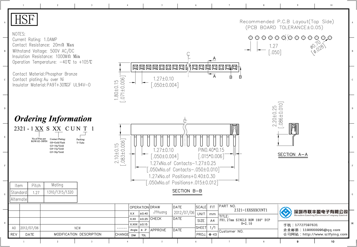 產(chǎn)品分類:排母連接器 產(chǎn)品規(guī)格:1.27MM 單排 180DIP 排母 供應(yīng) 聯(lián)豐盈廠家 產(chǎn)品介紹:額定電流:1.0amp電流電阻:20m最大絕緣電阻:1000m民承受電壓:AC 500V /分鐘工作溫度:55﹣℃+ 105℃接