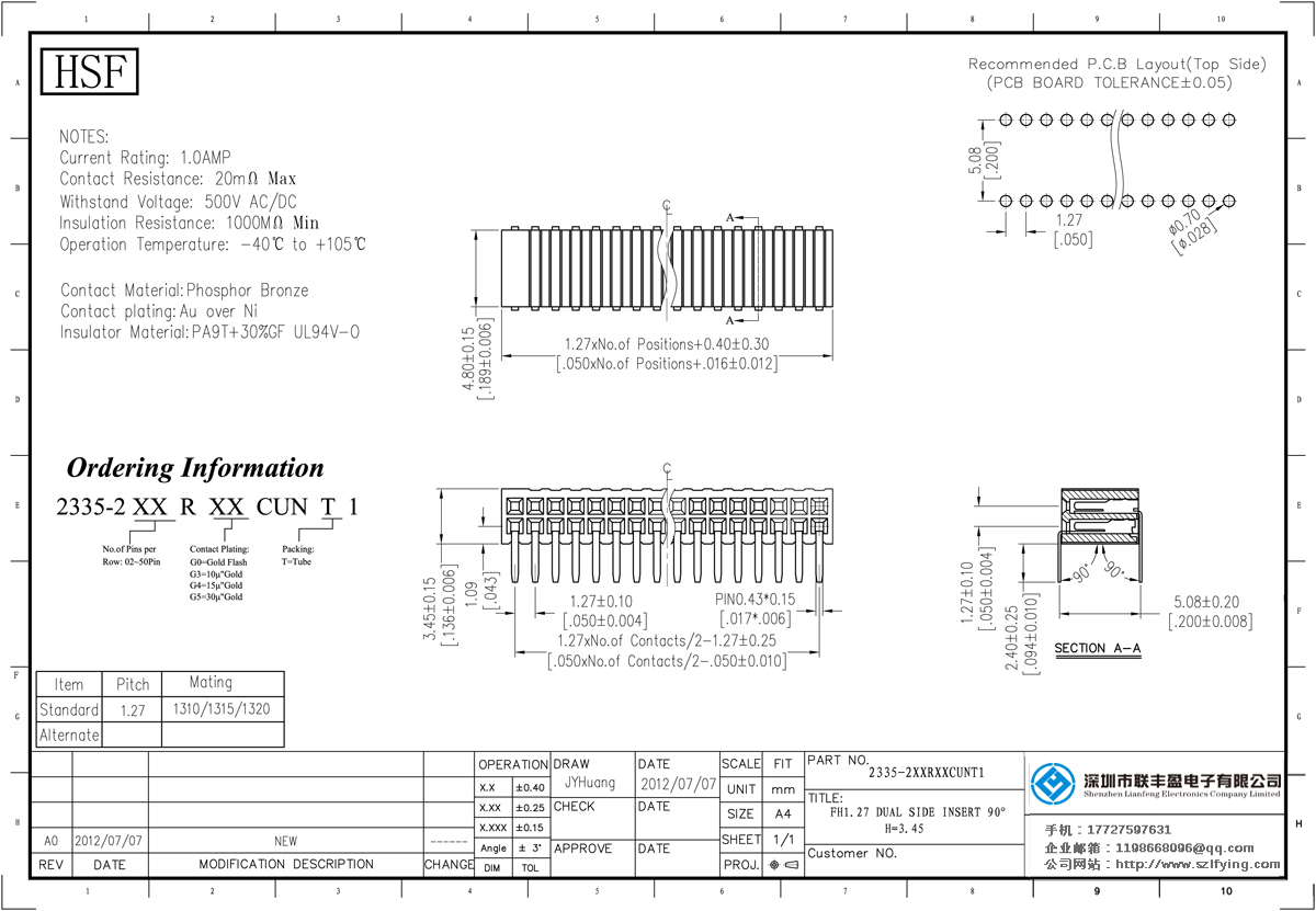 產(chǎn)品分類:排母連接器 產(chǎn)品規(guī)格:非標(biāo)定制 1.27MM 雙排 90度彎針 塑膠高度H=3.5MM 側(cè)插型 插板 排母 產(chǎn)品介紹:額定電流:1.0amp電流電阻:20m最大絕緣電阻:1000m民承受電壓:AC 500V /分鐘
