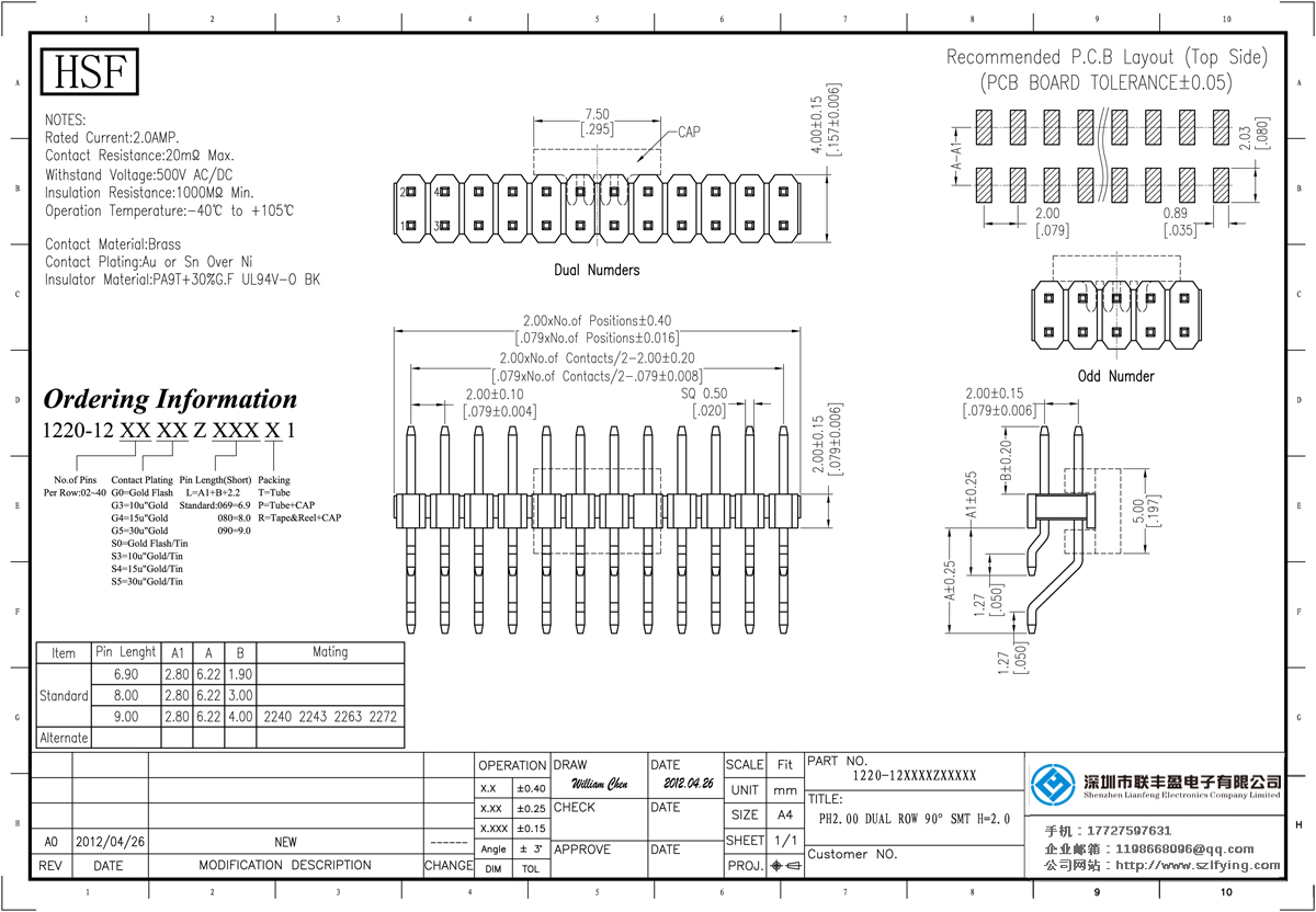 產(chǎn)品分類:排針連接器 產(chǎn)品規(guī)格:聯(lián)豐盈 2.0MM 單層雙排 90SMT(Type A) 排針 產(chǎn)品介紹:額定電流:2.0amp電流電阻:20m最大絕緣電阻:1000m民承受電壓:AC 500V /分鐘工作溫度:40﹣℃+ 105℃接