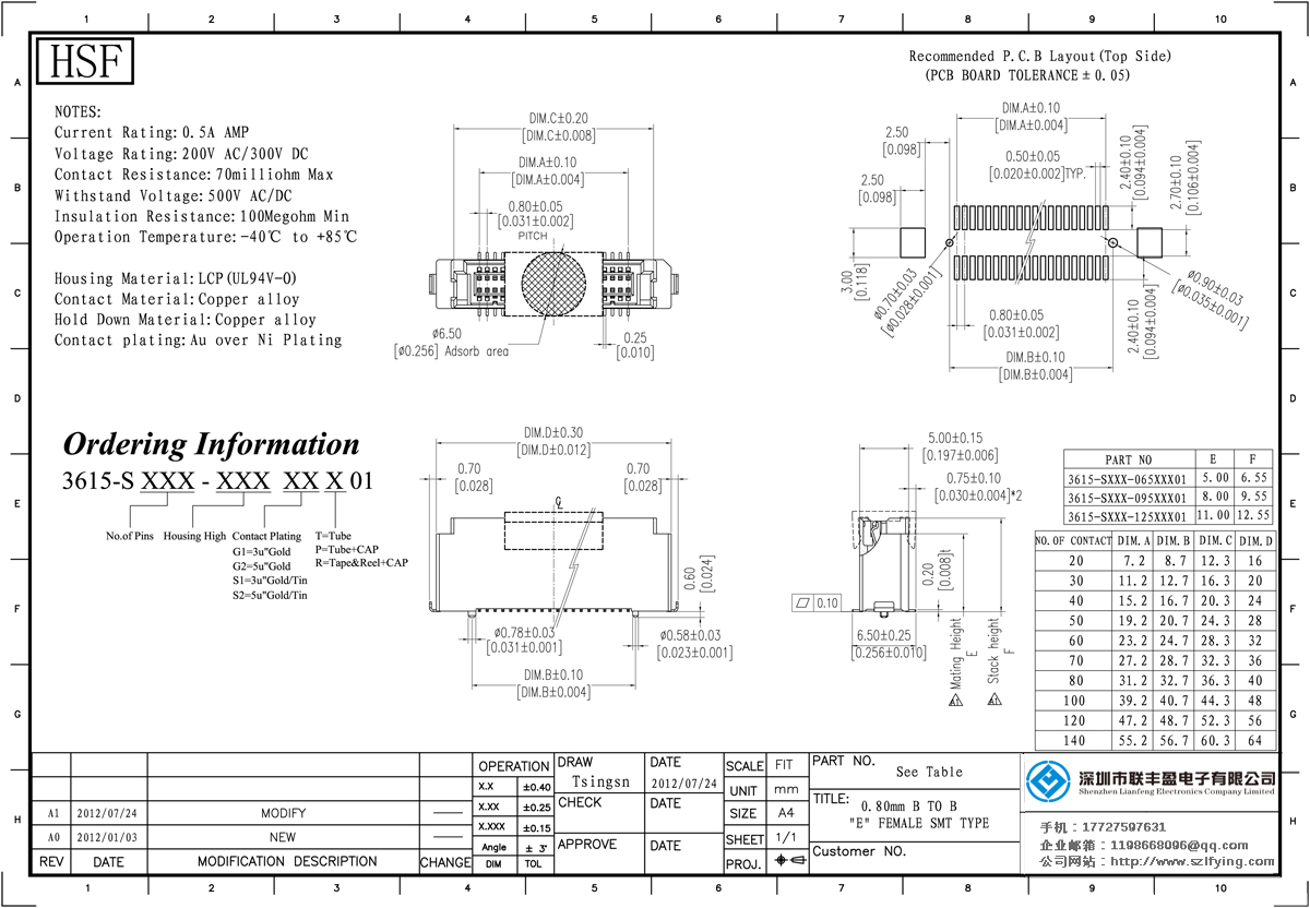 產(chǎn)品分類:Board To Board 連接器 產(chǎn)品型號:0.8MM 母座 卷裝 Board To Board 聯(lián)豐盈 技術(shù)參數(shù):額定電流:0.5amp電流電阻:65m最大絕緣電阻:1000m承受電壓:交流250V /分鐘工作溫度:40﹣℃+ 10