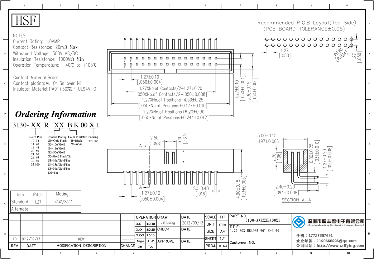 產品分類:簡易牛角連接器 產品型號:聯(lián)豐盈 抗氧化 1.27MM H=5.7 90DIP ,滿PIN 簡牛 廠家 技術參數:額定電流:1.0amp電流電阻:20m最大絕緣電阻:1000m民承受電壓:AC 500V /分鐘工作溫度: