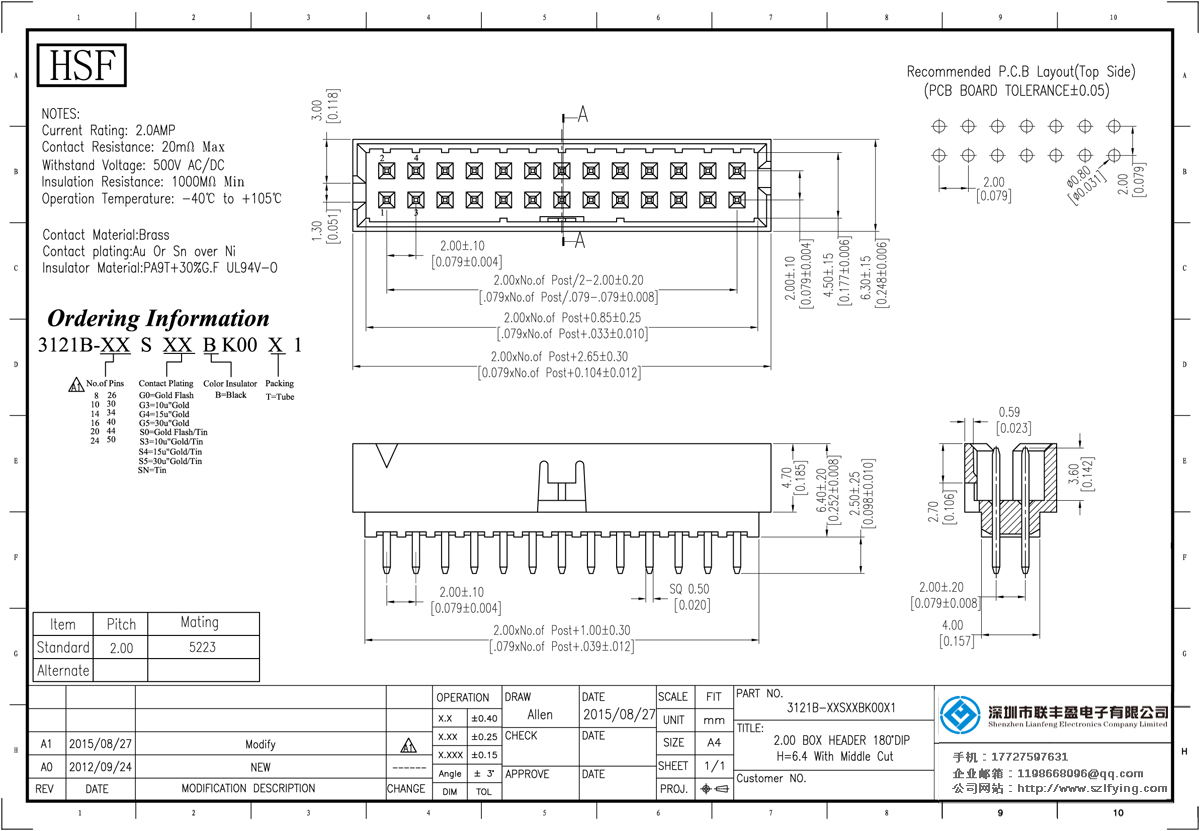 產(chǎn)品分類:簡易牛角連接器 產(chǎn)品型號:聯(lián)豐盈 2.0MM TYCO型 180DIP 簡牛 技術(shù)參數(shù):額定電流:2.0amp電流電阻:20m最大承受電壓:500V的交流/直流絕緣電阻:1000分鐘操作溫度:40﹣℃+ 105℃接